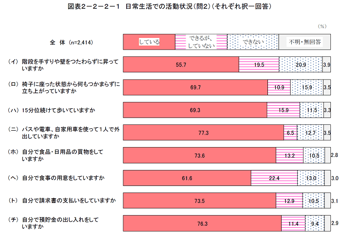 日常生活の8つの活動について、状況を質問した結果が図の通りになります。「バスや電車、自家用車を使って1人で外出していますか」、「自分で食品・日用品の買物をしていますか」については「している」+「できるが、していない」の合計が約85%を占めます。一方で「階段を手すりや壁をつたわらずに昇っていますか」に対して「している」+「できるが、していない」の合計は約75%となっていて、10%の差が見られます。階段を昇ることが負担の一つになることが伺えます。