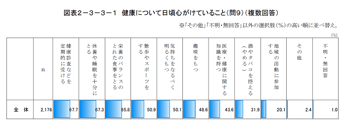 健康について日頃心がけていることの内容は、図の通りになります。この質問の前の質問で。9割の方が、健康について心がけていると回答しています。健康について心がけていると回答した人々の心がけている内容を確認すると、高い順に「健康診査などを定期的に受ける」(67.7%)、「休養や睡眠を十分にとる」(67.3%)、「栄養のバランスのとれた食事をとる」