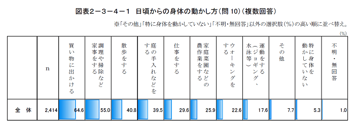 日頃からの身体の動かし方として内容を確認すると高い順に、「買い物に出かける」 (64.6%)、「調理や掃除など家事をする」(55.0%)、「散歩する」(40.8%)になります。少し激し目の身体の動かし方としては、「ウォーキングをする」(22.6%)、「運動をする (ジョギング・水泳など) 」(17.6%)が挙げられています。「特に身体を動かしていない」と回答した方は5.3%でした。