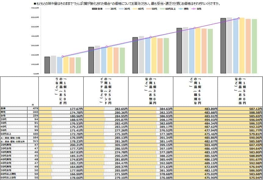 おにぎり、サンドイッチなど商品でたんぱく質が強化された場合の「適正だと感じる価格」についても尋ねました。その結果、30円前後の上昇幅が適正と感じる結果となりました。加えて、「たんぱく質が強化された場合の高いと思い始める価格」、「たんぱく質が強化された場合の高すぎて買わないと思い始める価格」についても尋ねたところ、それぞれ60円前後の上昇幅、100円前後の上昇幅という結果になりました。