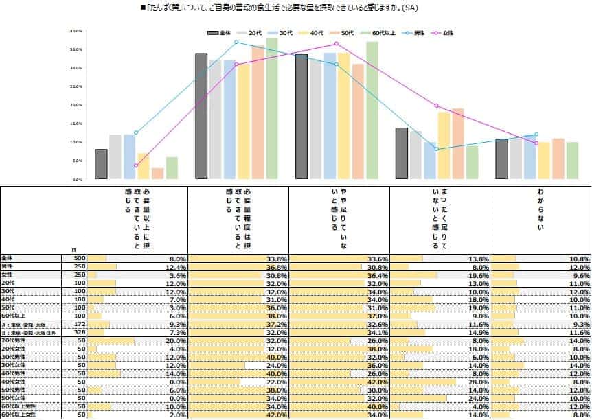 「日本人の食事摂取基準(2020年版)」では、一日あたりの推奨量が、30~49の男性で65g、女性で50gとなっています。しかしながら、多くの人がこの摂取量を満たせていないことが指摘されています。今回の調査で、たんぱく質摂取量の過不足に関する自己認識を尋ねたところ、「やや足りていない」、「まったく足りていない」と答えた方が47.4%に達しています。ここからも、摂取不足気味なことが伺えます。