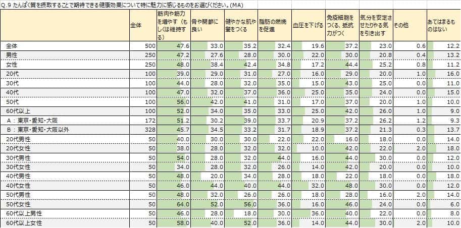 たんぱく質の健康効果の中で魅力に感じるものを尋ねたところ、高い順に「筋肉や筋力を増やす」が47.6%、「免疫細胞をつくる」が37.2%、「健やかな肌や髪をつくる」が35.2%、「骨や関節に良い」が33.0%となりました。「筋肉や筋力を増やす」が約半数と高いスコアであり、筋トレと関連した近年のたんぱくブームの影響が感じられます。特に50代以上では、50%を超えています。また、「健やかな肌や髪をつくる」は男性よりも女性のスコアのほうが高く、年代や性別によって魅力を感じるたんぱく質の健康効果に顕著な差が見られました。