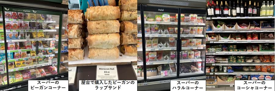 スーパーではVeganマークの付いた商品がソーセージ、ナゲット、ハム、チーズ、パンのディップソース等が多種類揃っていました。ヨーロッパにおけるVegan品の需要の高さを感じられました。さらにスーパーの棚では、ハラルやコーシャ向けのコーナーが明確に分類されており、宗教ごとに異なる食文化への配慮が感じられました。