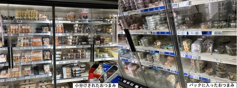 スーパーには多品種のおつまみが陳列されていた。コロナをきっかけにホームパーティーの習慣が広がっていて需要が高まっているとのことです。