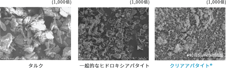 ナノサイズの微細な粒子が集まり多孔質のような構造を取ります。一般的なヒドロキシアパタイトよりも表面積が広く、高い吸着力を発揮します。その吸着力はタルクの11倍にもなります。