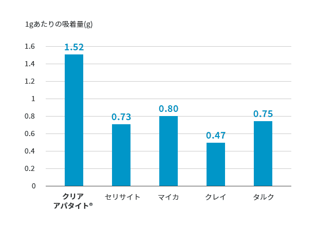 下のグラフの通り、クリアアパタイト®による吸着量が最も多い結果となりました。人工皮脂の吸着において、セリサイトやマイカ、クレイ、タルクよりも優れた結果でありました。