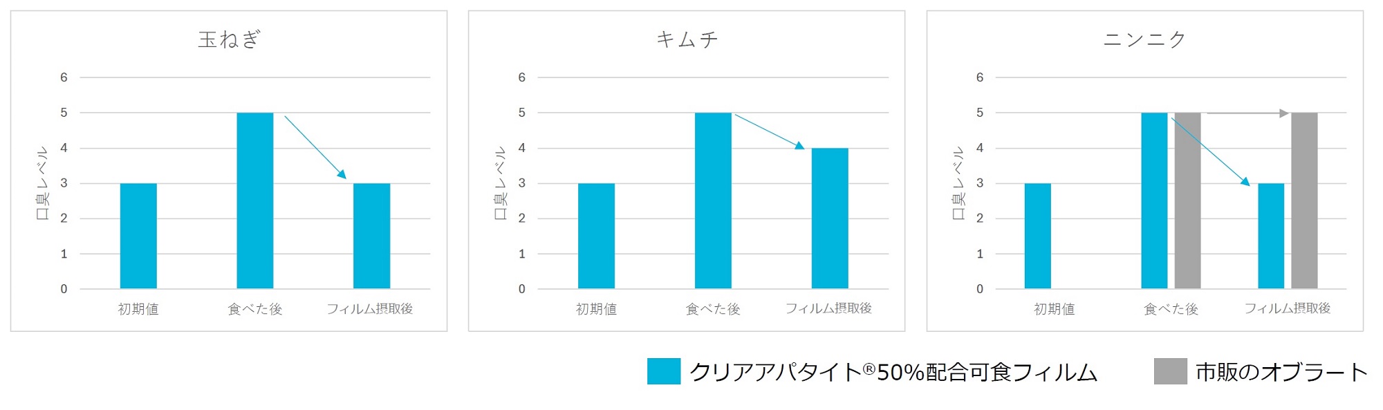 臭いの強い食べ物を摂取した後に、クリアアパタイト®50%配合の可食フィルムを1枚摂取しました。